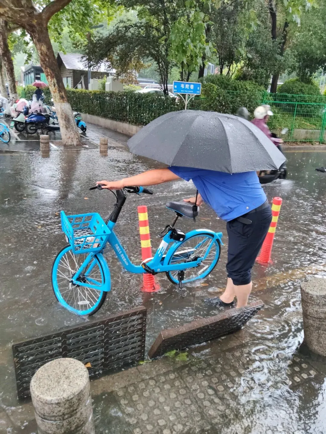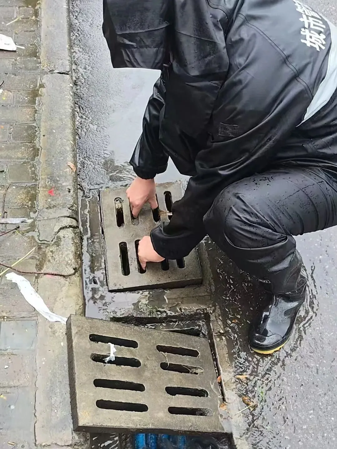 玄武城管大队执法人员打开下水井盖,清理排水口淤堵杂物,确保排水通畅,以防积水过深影响市民通勤。还在打开的排水口周边设置警示标志,以避免发生意外事故。