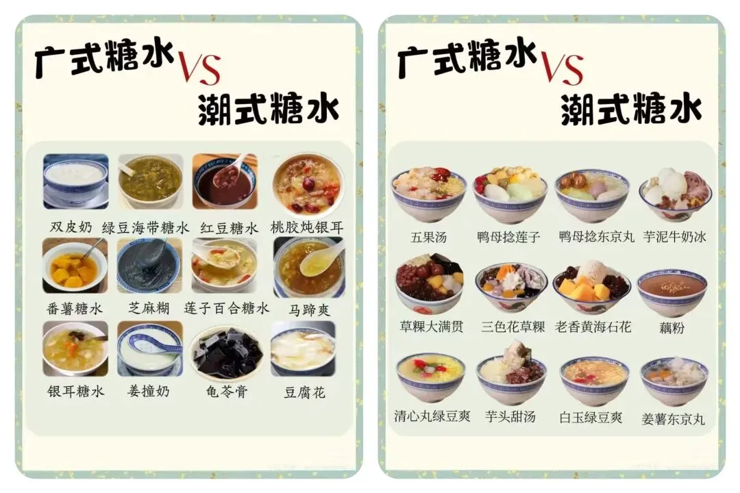 我有问过广东当地朋友,广式甜品和潮汕甜品有什么区别,她甩给我这张图,你别说,真就一目了然了。以广州和珠三角地区为代表的甜品,食材上偏重奶制品和水果谷物,讲究细腻顺滑,清甜滋润,更关注火候和食材本味;潮汕地区的甜品则更注重糖油融合,口感更丰富,味道更醇厚,整体风味更偏向闽南地区。总之不管是哪一款,能为生活带来愉悦的一点甜,就是美好的呀。