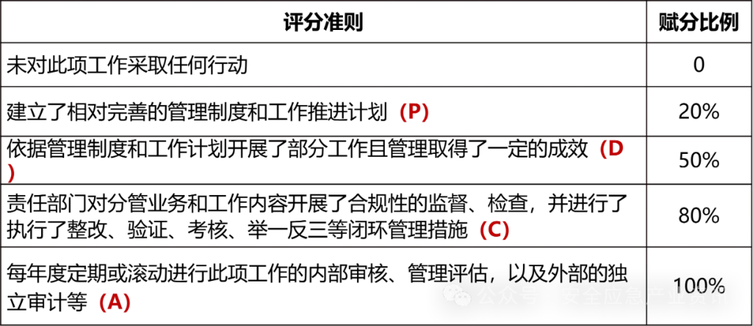 评分规则:为了准确分析和评估企业安全管理系统的问题,依据各安全管理要素的审核要点清单,采用国际上通行的5区间打分对每个管理要素从制度(P),执行(D),检查(C)和改进(A)四个方面进行量化评分,具体评分规则如下: