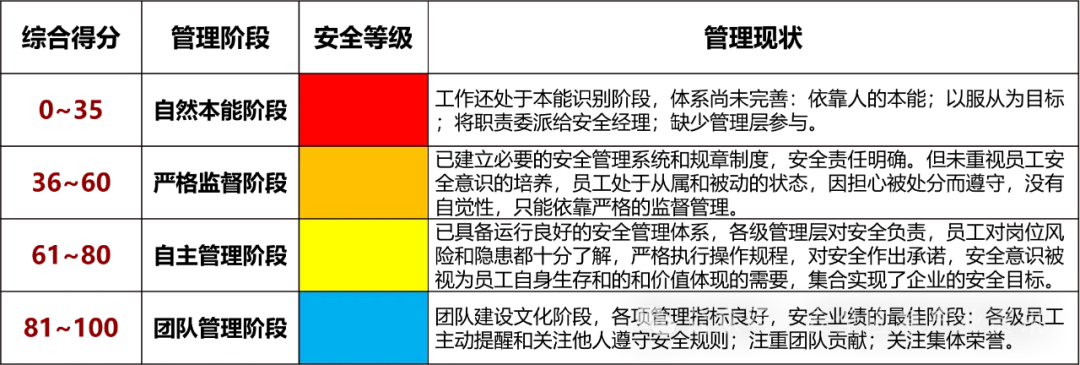 风险评级:依据风险分级管控要求和布莱德利安全文化曲线特征,按照企业安全审计综合得分将企业安全管理水平分为红、橙、黄、蓝四个风险管理等级,分别对应“自然本能、严格监督、自主管理、团队管理”四个安全管理阶段。