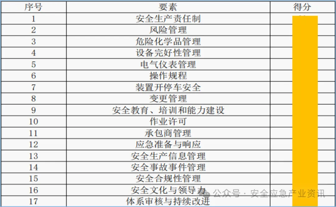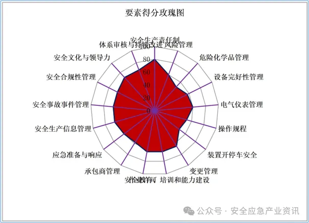 各管理要素处于相对均衡的管理水平,但是在风险管理、危险化学品管理、操作规程管理、装置开停车管理、电气仪表管理等要素管理水平有待进一步强化和提升。根据各管理要素得分以及要素权重,可以得出南京XXXX有限公司安全管理水平综合评分得分为 XX 分,即企业安全管理处于“自主管理”初期阶段,安全风险等级为黄色。