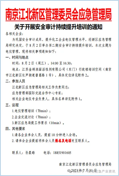 7月30日,应北京朗泰华科技发展中心邀请,应急管理部国际交流合作中心过程安全管理推进及企业安全文化创建专家组成员刘彦军通过直播的形式,在“泰华讲座”上分享了《南京市江北新区化工(危化品)企业安全审计经验》。他从审计流程概述、审计结果综述、审计持续服务等方面,通过大量成功案例,介绍了在南京市江北西区开展化工(危化品)企业安全审计的经验做法。