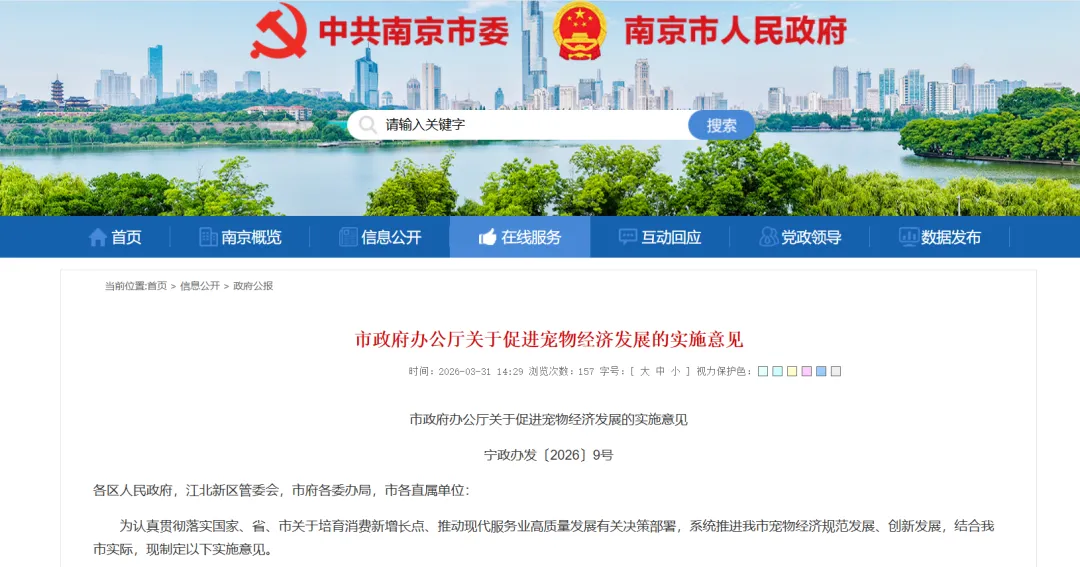 南京市发布了《关于促进宠物经济发展的实施意见》,设定了到2030年产业规模突破150亿元的宏伟目标,并计划打造全国宠物经济创新策源地。