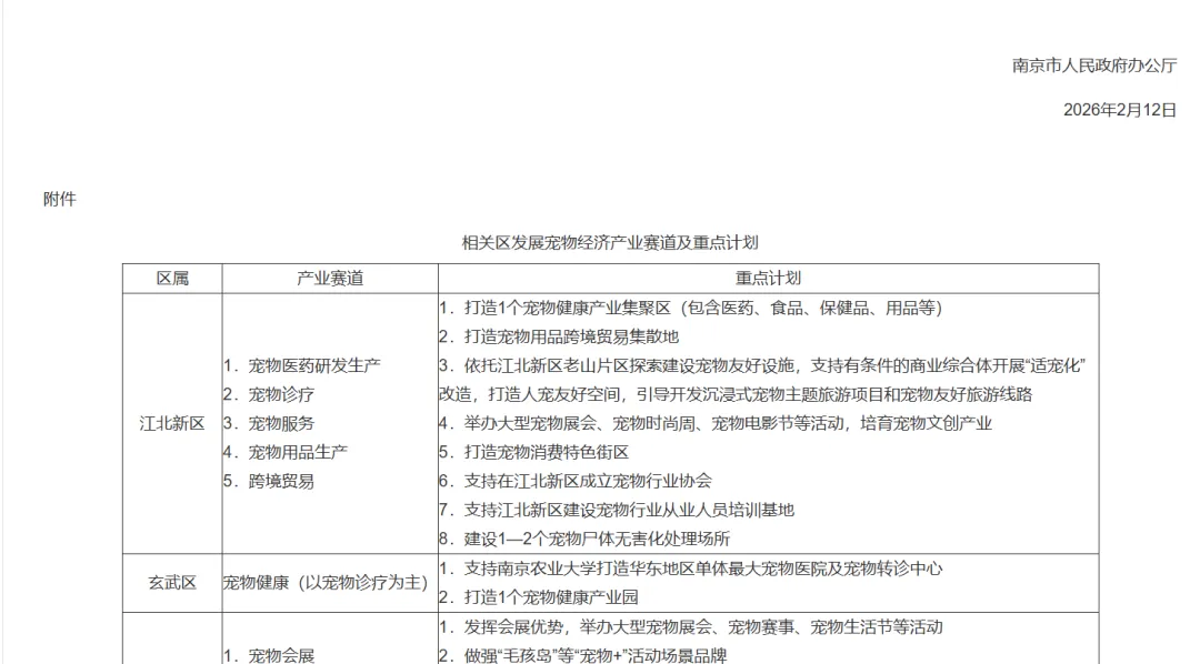 产业集群布局:明确在各区打造特色鲜明的宠物产业集群。例如,在江北新区、玄武区打造宠物健康产业集聚区;在高淳区打造宠物食品和用品生产集聚区;在栖霞区打造宠物消费集聚区。