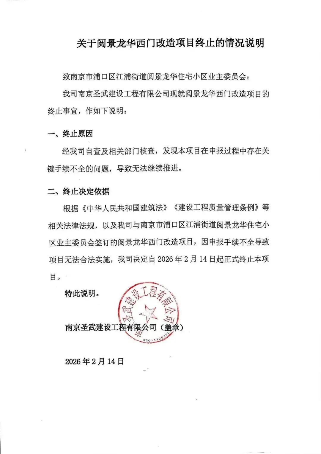 >南京圣武建设工程有限公司关于阅景龙华西门改造项目终止的情况说明