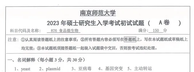 2023年南京师范大学882食品微生物考研真题试卷