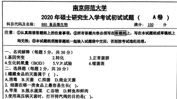 2020年南京师范大学880食品微生物考研真题试卷