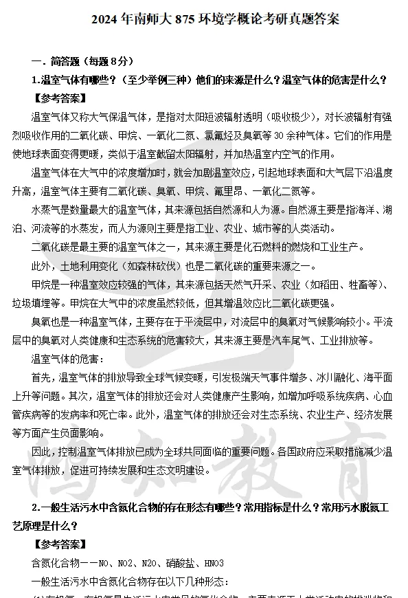2024年南京师范大学875环境学概论考研真题答案