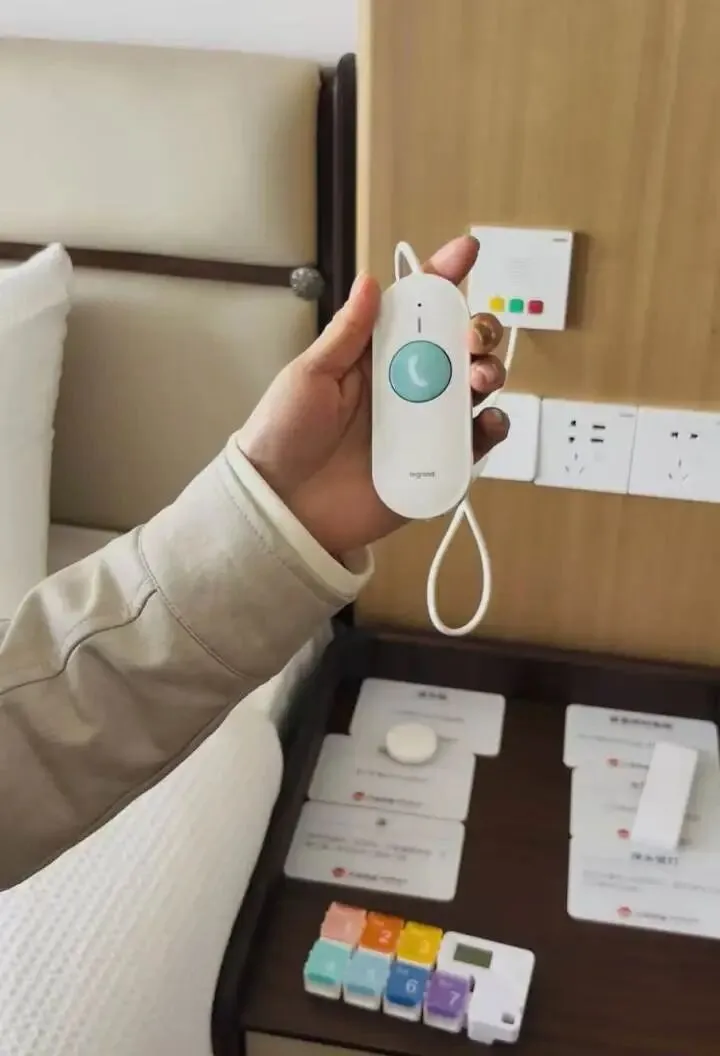 房间和客厅的所有桌角都磨成了圆弧形,床头放着一个电子药盒,用不同颜色标记一周7天的药量,还能语音提示。沙发和床比普通家庭的偏硬,两张床的床头,都有“一键呼叫”按钮。