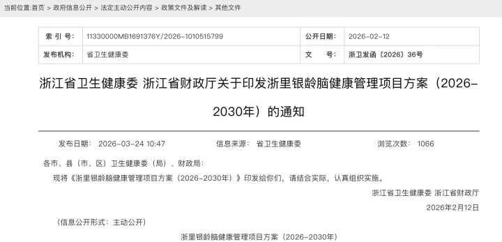 近日,浙江省卫生健康委、省财政厅联合印发《浙里银龄脑健康管理项目方案(2026-2030年)》,提出全省65岁及以上老年人按照“知情同意、自愿参与”的原则开展认知功能筛查,每5年至少完成一次。到2026年底,初筛率达到20%以上;到2030年,初筛率达到80%,初筛阳性人群干预指导率达到80%,疑似认知障碍人群就诊率达到50%。