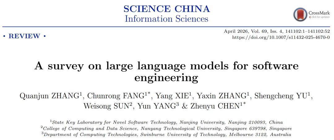 引用本文: Zhang Q J, Fang C R, Xie Y, et al. A survey on large language models for software engineering. Sci China Inf Sci, 2026, 69(4): 141102, https://doi.org/10.1007/s11432-025-4670-0