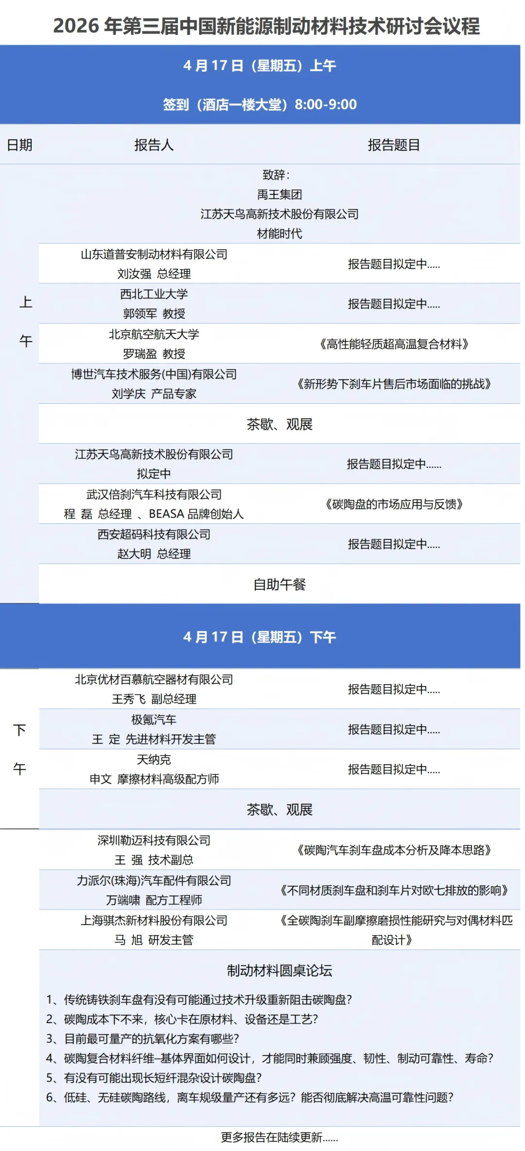 辽阳坤鼎石墨制品有限公司诚挚地邀请您参加2026年4月16-17日于南京举行的“2026年第三届中国新能源制动材料技术研讨会”。本届会议由山东道普安制动材料有限公司与材能时代联合主办,江苏天鸟高新技术股份有限公司晚宴赞助。期待与您相聚南京,共议行业前沿技术与发展。