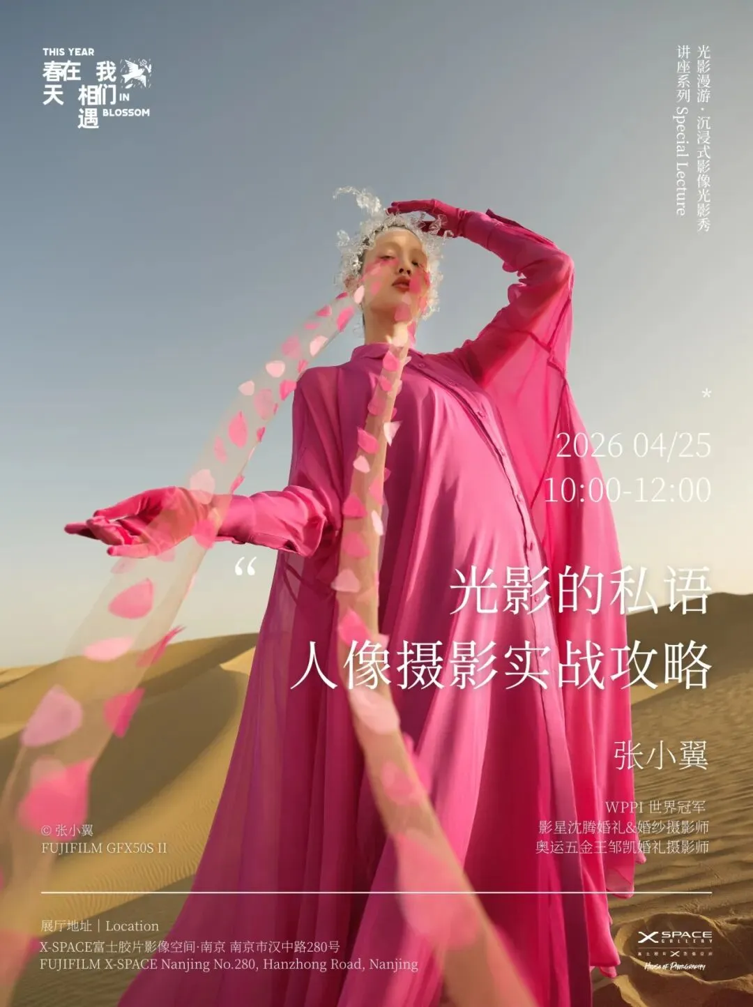 本次讲座特邀WPPI世界冠军、知名影星沈腾婚礼摄影师——张小翼,带来沉浸式人像实战教学,现场将有专业模特实景出镜,从相机实操、镜头选择、参数设置,到构图引导、情绪捕捉,室内理论分享与室外实战拍摄演示,带你完整呈现人像作品的创作全流程。