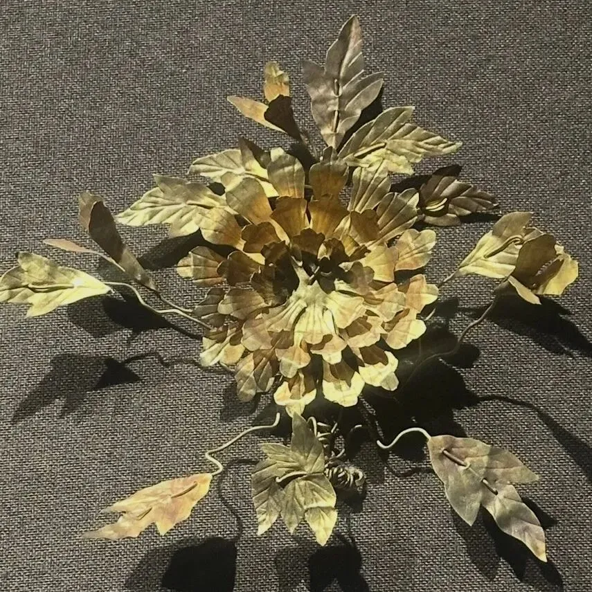 用薄薄的金片锤鍱成花瓣和叶子,叶脉和花蕊清晰可辨。花瓣及叶片都极薄,错落层叠,仿佛在微风中颤动摇曳,风姿绰约,妩媚动人。牡丹花象征富贵荣华,深受古代贵族妇女喜爱。