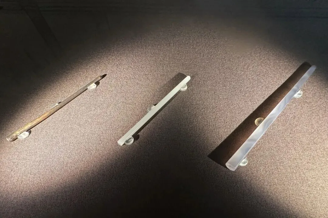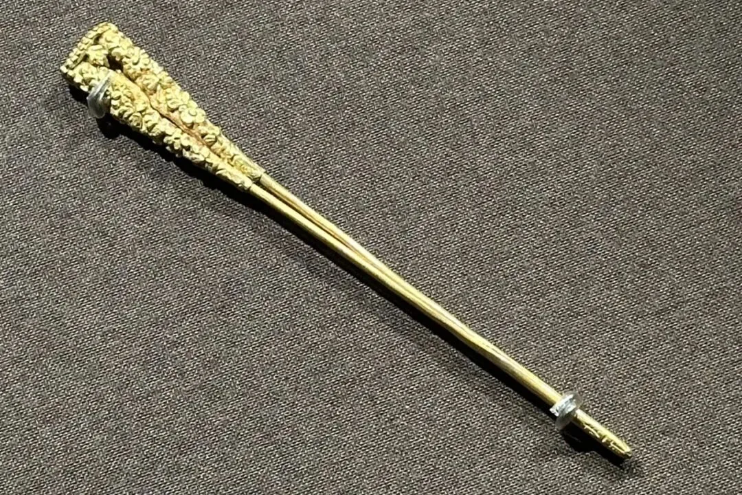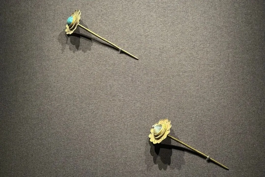 两件金簪形制相似,仅镶嵌物不同,分别为猫晴石和绿松石。簪体呈圆形,簪头作花瓣形,围以金丝做成花蕊,中心嵌宝石。猫晴石又称“猫儿眼”,经光照射可在宝石中央形成一道细长的线柱,极似猫的眼睛而得名。史书记载这种宝石产自南亚的锡兰(今斯里兰卡一带),因其罕见而益显贵重。绿松石又称“松石”,因其“形似松球,色近松绿”而得名。颜色多为鲜艳的蓝绿色,质地细腻柔和,有的表面布满黑色蛛网纹,有蜡质光泽。