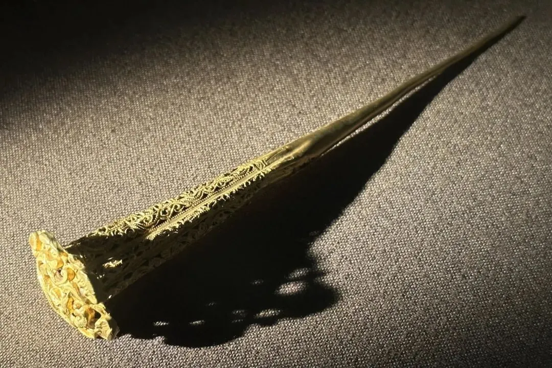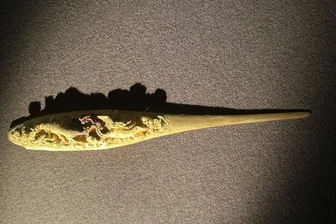 簪首宽圆,簪脚渐趋窄尖,形若一枚织布梭。簪首以锤鍱、錾刻等工艺作麒麟凤凰,一端为奔行回首的麒麟,一端为俯首低飞的凤纹,披垂的凤尾仿佛流云托起麒麟的后足,空白处满饰灵芝卷草。这种簪子是由唐式搔头演变出来的一种新样式,主要流行于两宋。