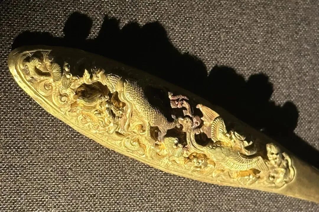 呈镂空花筒形,属新创的宋式簪。在一枚金片上镞镂、打造六道以联珠纹勾出的缠枝卷草,两边以联珠纹组成的双线勾勒纹样边框,最后合卷为锥形簪筒。簪顶饰六朵灵芝环绕的团龙纹。近簪脚处錾刻“梁四郎□团造”六字。样式奇巧,类似于花筒簪,却更以镞镂工致见长。