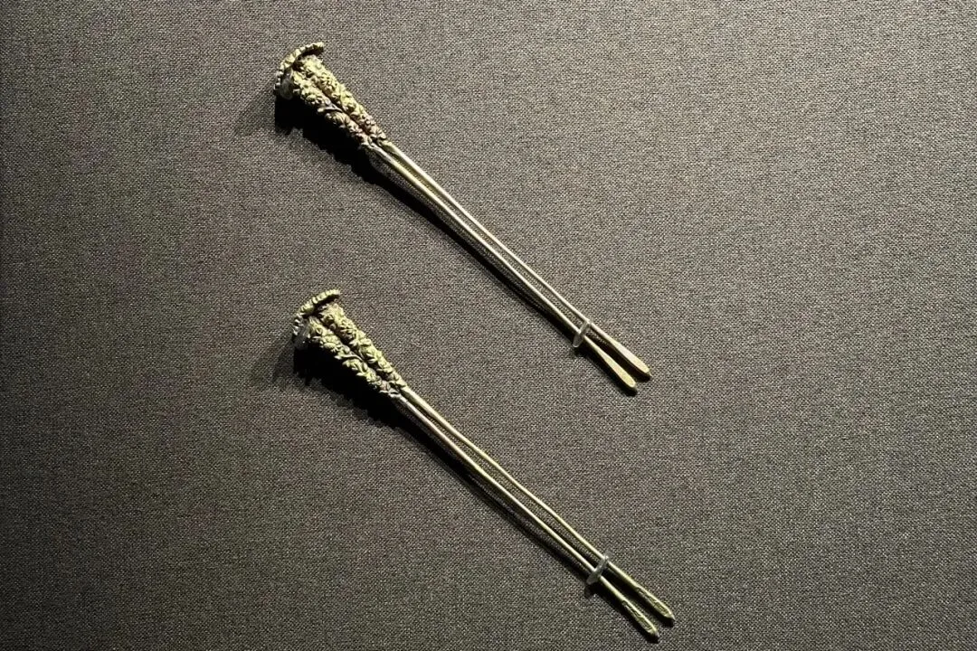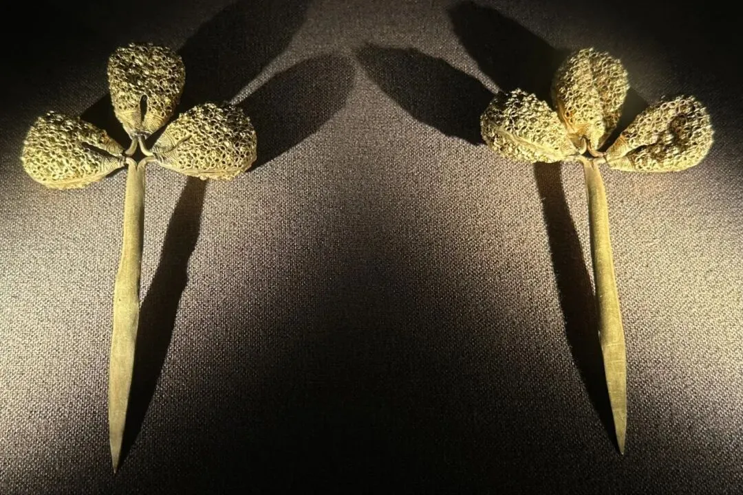 金簪为一对,形制相同。簪脚尖细,簪体扁平。簪头为三个镂空花果,呈品字形排列。一只簪脚相连多个花头造型的簪,是宋元时期桥梁簪的一种样式,花头可多可少,数量从两只到五只不等。