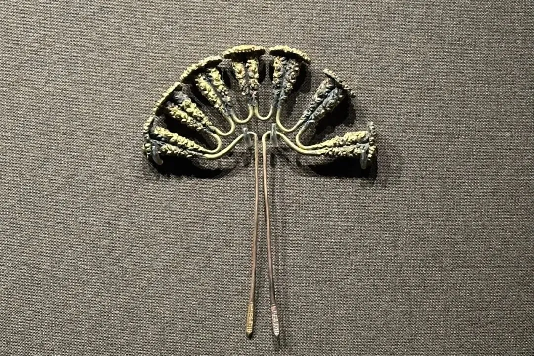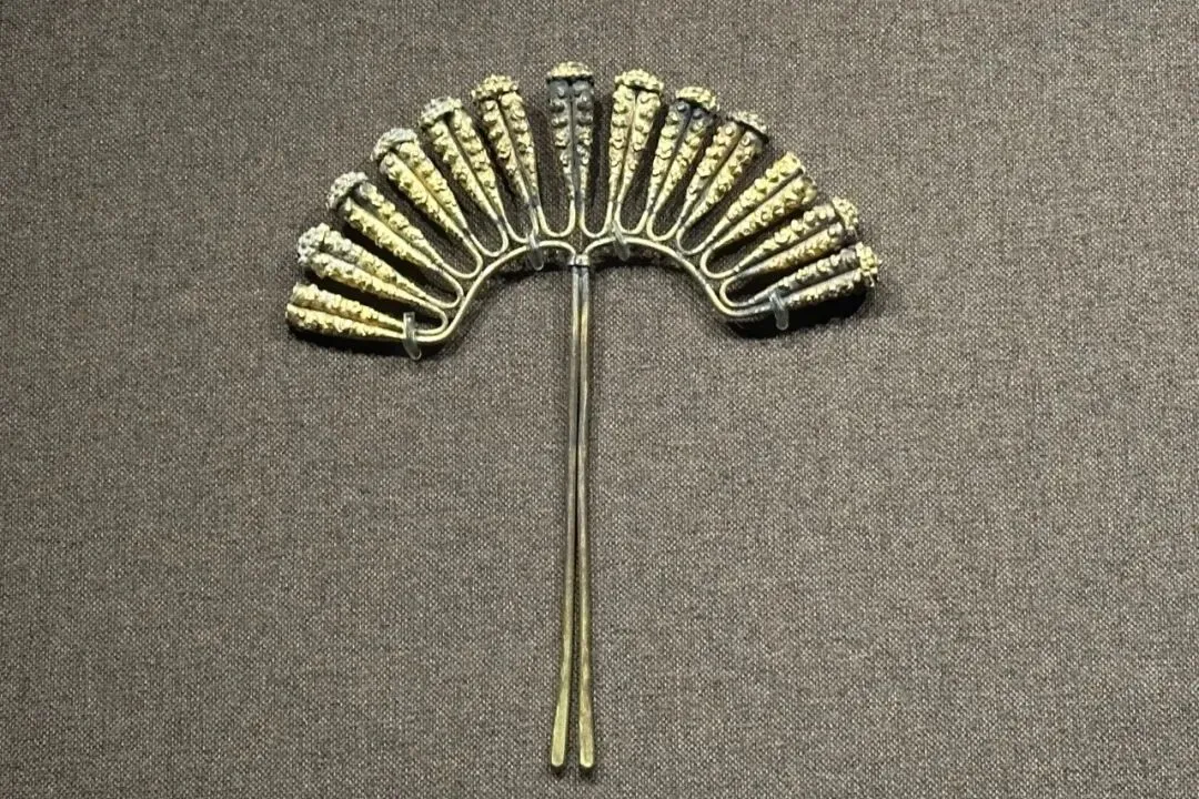 宋代典型的多头桥梁钗,可视作并头花筒钗在数量上的扩展。弧形的钗梁上并列花筒十三对,星扇形,花头錾刻花卉纹。