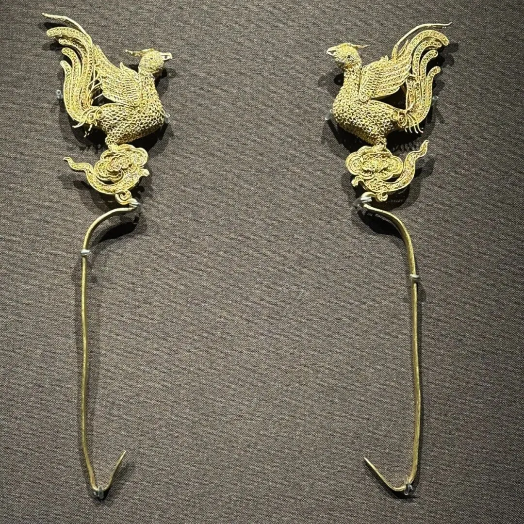 插饰为一对,造型为金色的凤凰昂首展翅,硕大而美丽的尾羽向上翻卷,矗立云端凌空欲舞,下接扁平钩状簪体。运用了累丝、搓花丝、炸珠、焊接等多种工艺,代表了明代金银细工的高超水平。从明代命妇画像中可以看到,这种成对的风凰形插饰是用于凤冠之上的,插于凤冠两边,凤喙向外,并可街接珠串。