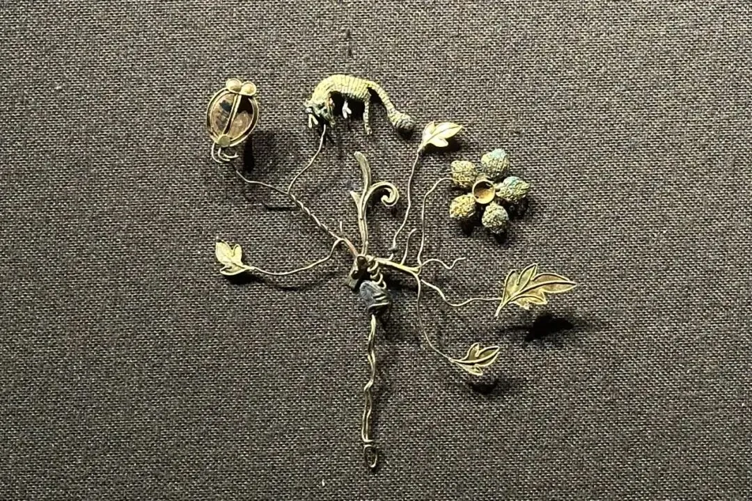 以金丝制成花形树枝,七个枝头上分饰牡丹叶、梅花、瑞兽及异果,中间镶嵌一枚菱形紫晶。如此繁花似锦的一树,因其材料的轻薄,其重仅有7.17克。这种造型独特的花树形金饰件,可以算作是古典样式的“步摇”,多用于高髻上的迎面插戴。