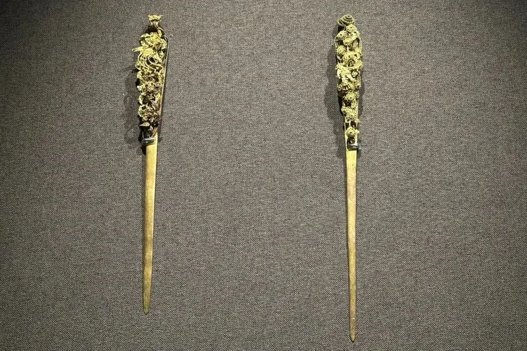 两件金簪形制相似,仅所饰花卉有所区别,分别为菊花和牡丹。簪体为扁平状,簪首以累丝技法做成地纹,上饰凤凰栖息于花丛中。明代是金银细工空前发展的一个鼎盛时期,尤以首饰最为华丽。