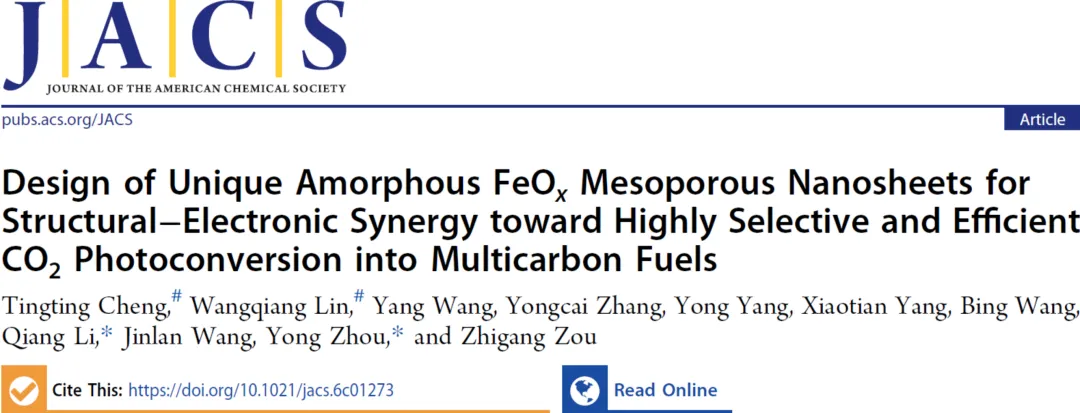 通过合成非晶态FeOₓ介孔纳米片,并利用脉冲激光刻蚀增加氧空位浓度和Fe²⁺/Fe³⁺比例,实现了对催化剂几何与电子结构的协同调控。该催化剂在520 nm光照下表现出优异的乙烷选择性(产率选择性70%,电子选择性94%)和1.60%的表观量子效率。机理研究表明,介孔结构增强了传质与空间限域效应,而Fe³⁺与相邻Fe²⁺位点分别主导CO生成和C-C耦合,形成串联催化路径,有效抑制了CO脱附并稳定了*OCCO中间体。