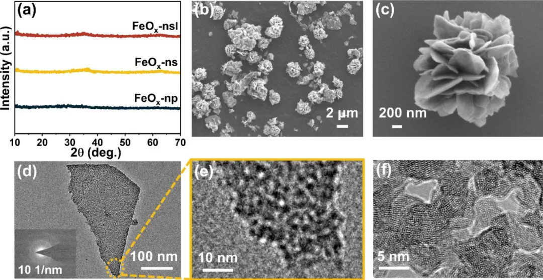 图1:(a) FeOₓ的XRD谱图,(b-c) SEM图像,(d-f) TEM图像(插图:SAED图)以及FeOₓ-ns的HRTEM图像。