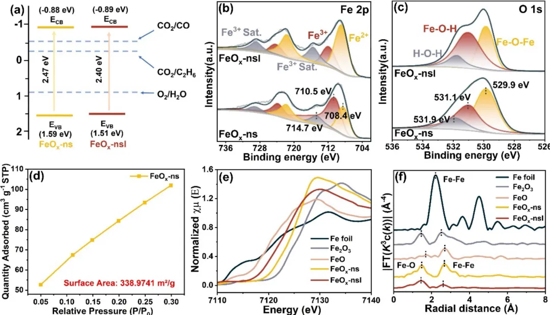 图2:(a) 能带位置图,(b) 样品的Fe 2p和(c) O 1s的XPS谱图,(d) FeO-ns的氮气吸附等温线,(e) 样品的Fe K边XANES谱图和(f) Fe K边EXAFS谱图的傅里叶变换。