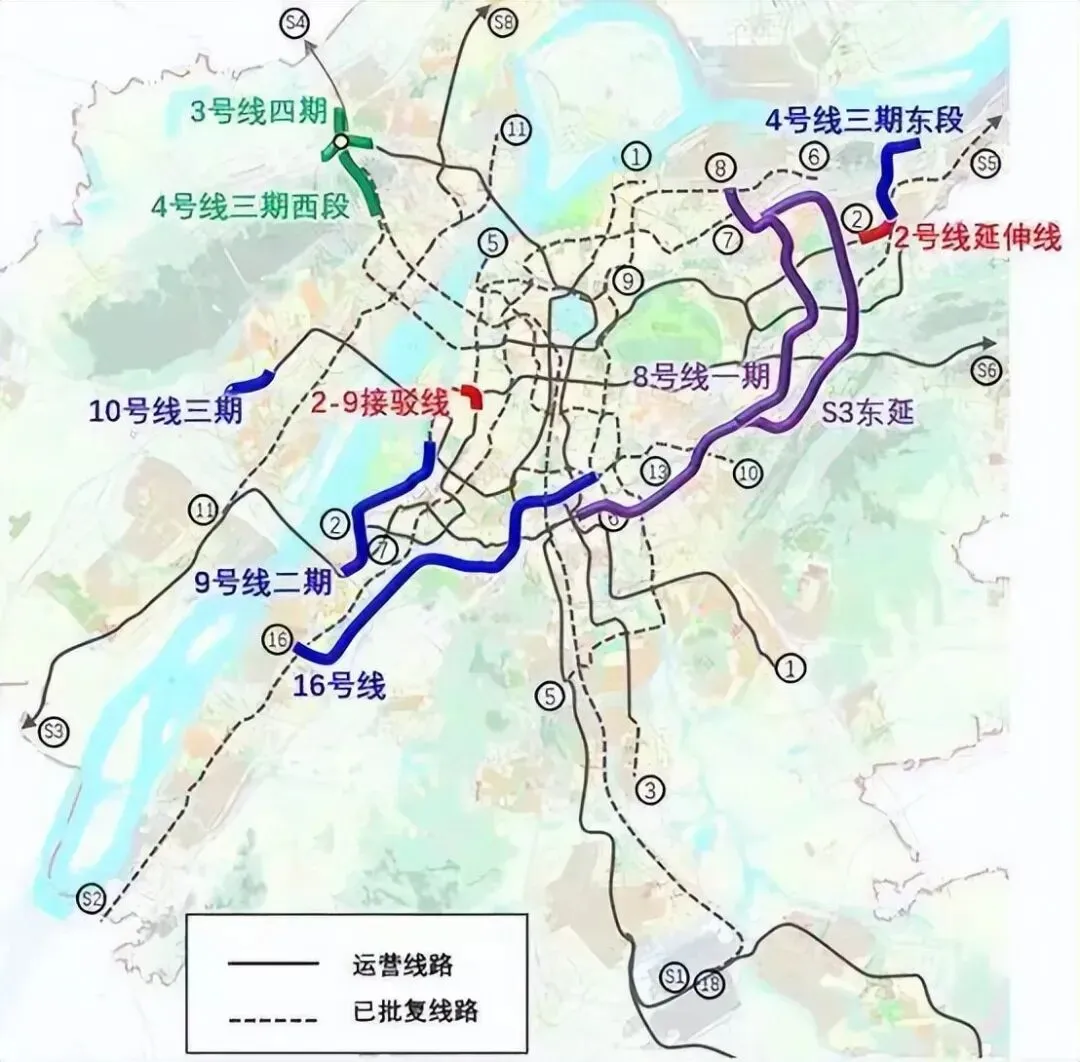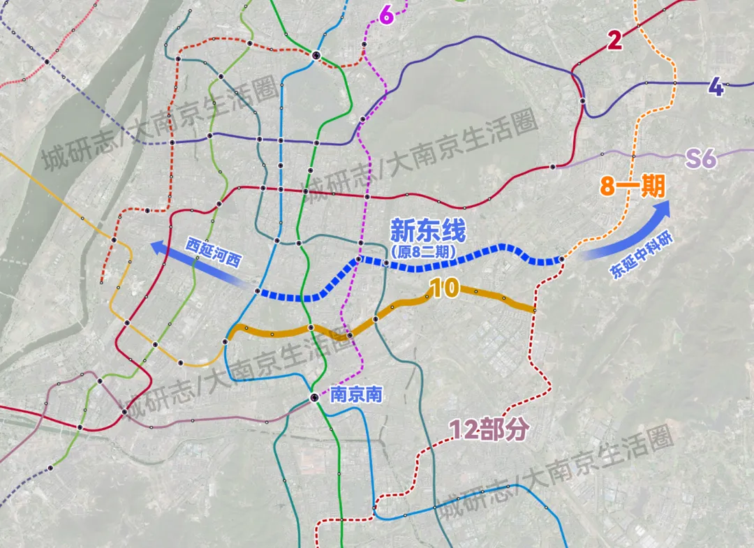 而且因为直通南站,可以大大降低城际、旅游等对外客流对于1、2、3等传统主线的压力。比如现在从南站到麒麟门,那可不就有点折腾吗,多次换乘差不多需要1个小时,关键非得从老主城绕一圈,先进城再出城,疲劳感拉满。学生从南站到仙林也是同样的逻辑,关键几乎没有其他更方便或更快的选择。但S3部分+8号线一期这么一串,就方便许多了,关键不用再绕老主城,效率大大提升。按照这个思路也可以将8号线一期和12号线的部分也可以合并为一条线,这个方案的好处是彻底将仙林、麒麟和江宁核心区域串联了起来,相当于组了个大环线。对于江宁内部的融合有很大意义,对于人口的覆盖面也更大。但沿线连接的更多是纯近郊,客流量可能不是特别足,算是各有优势吧。不管是8一期+S3(部分)还是8一期+12(部分),这两个环线都实现了东部区域完全意义上的地铁组网。后期随着东部与主城通勤量的加大,可以在10号线与2号线之间再加一条东西线,比如8号线二期。 这样一来东西向两条主线的配置就比较充分了。我个人觉得8二期的线位可以适当修改,可以继续西延到河西,同时东延到中科院一带。