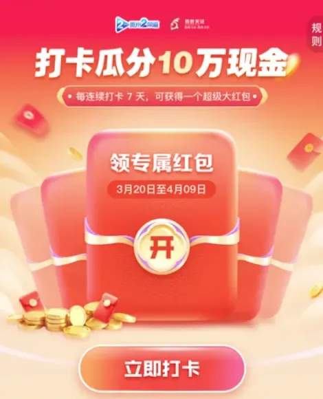 3、3月20至26日、3月27至4月2日、4月3日至4月9日,打卡满7天,分别抽取1次大红包,总共可抽取3次。数量有限,先到先得;