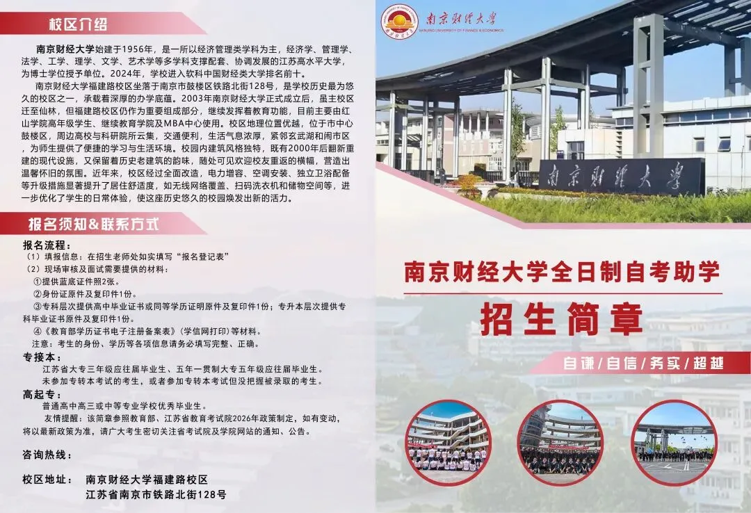 (二)线下报名:提前一天报备预约,携带身份证和报名费,学生本人到南京财经大学福建路校区自考招生办公室办理报名手续。