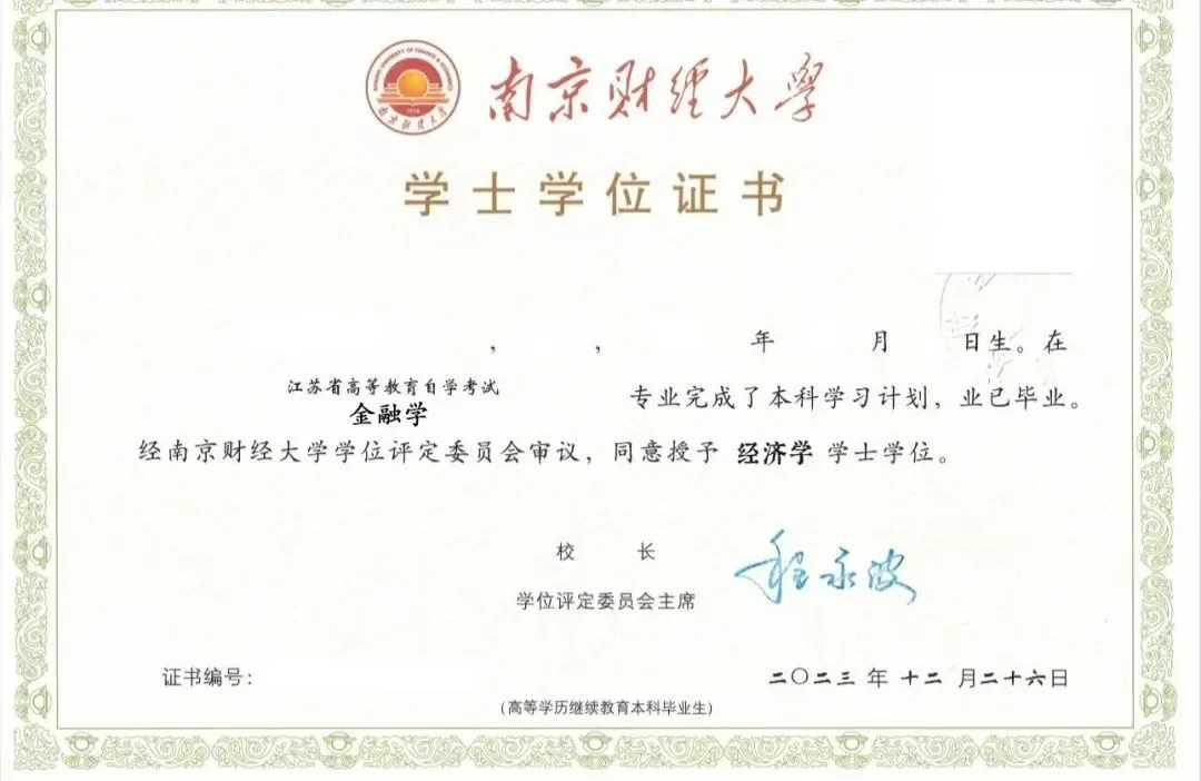 5.学生完成本专业考试计划规定的课程,获得毕业证书。毕业证书由江苏省高等教育自学考试委员会颁发,学校附署盖章、国家教育部承认学历、符合学士学位授予条件的学生,由我校授予高等学历继续教育学士学位。