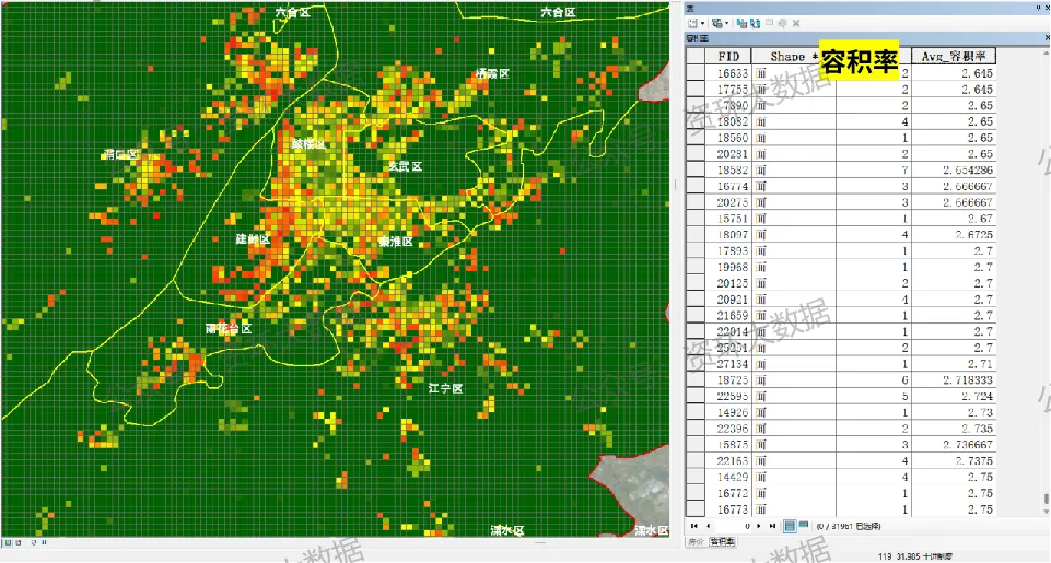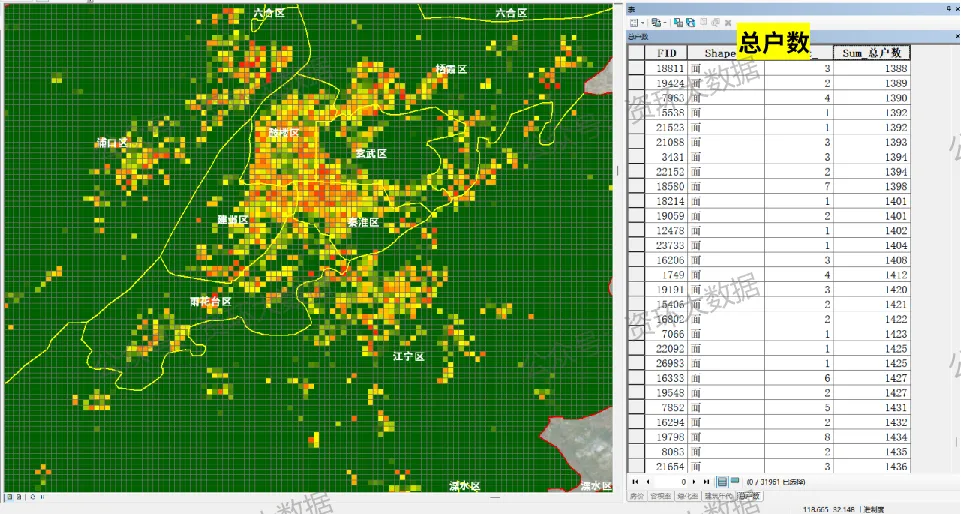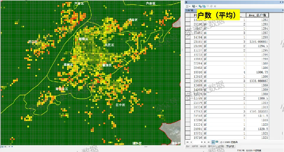 相较于难以精确空间定位的人口普查数据,网格化户数能更真实地反映人口居住的空间集聚强度。将该变量与同精度的容积率(建设强度)、绿化率(生态空间)叠加分析,可以定量揭示“人—地—绿”的空间耦合关系,是支撑城市公共服务设施配置、15分钟生活圈评估及社会空间结构研究的基础数据。