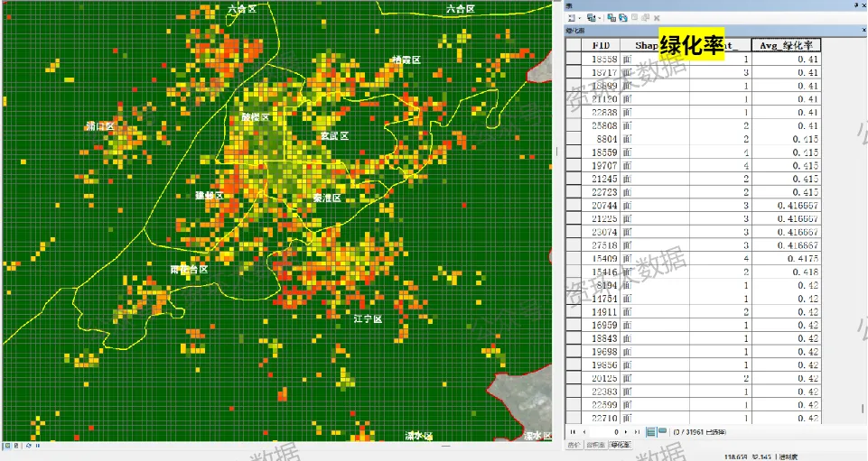 以每个网格为单元统计的居住小区内绿化覆盖比例,对于从定量角度研究绿地分布与建设强度的耦合关系,绿地短缺与否、热岛效应等有极大价值