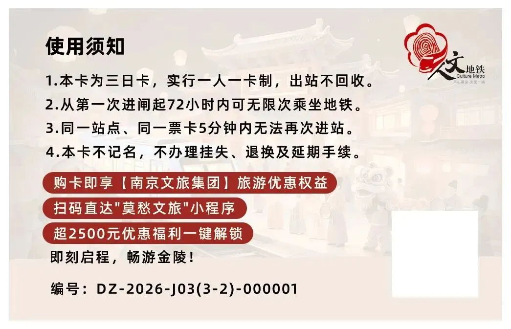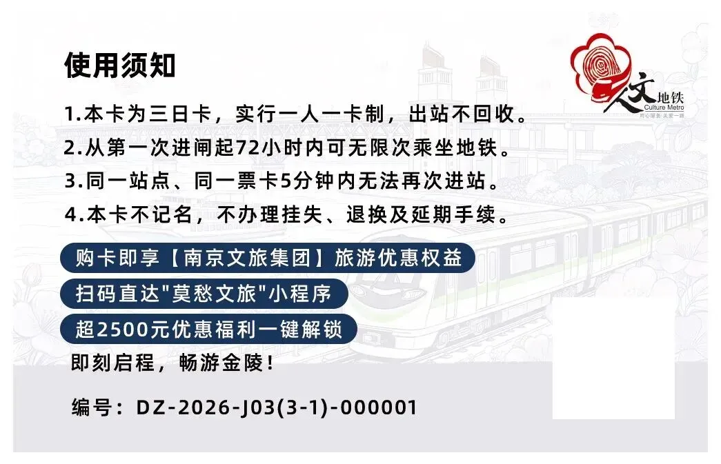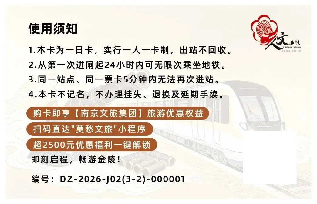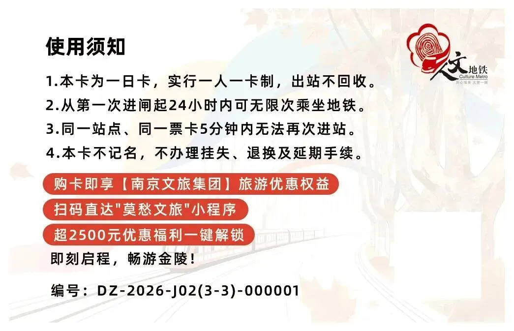 南京地铁畅游卡(一日卡、三日卡)现已推出2026年新版卡面,多款版面随机发售,即日起,在全线网车站均可购买,带你解锁跟着地铁逛南京的超绝快乐!