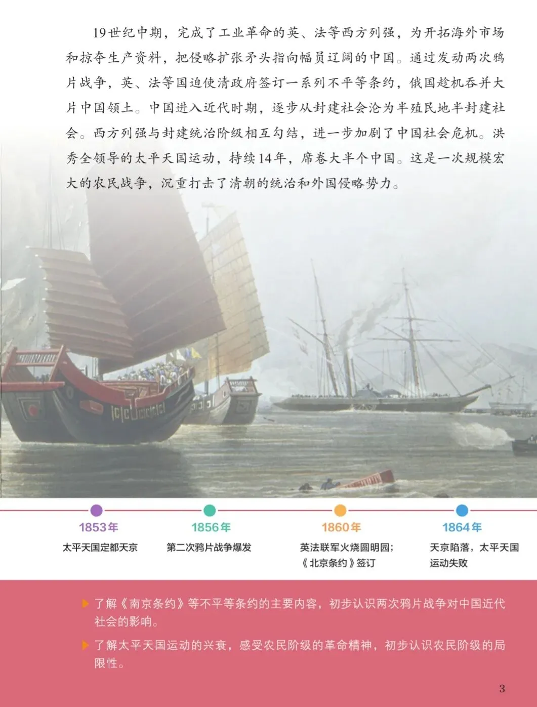 ——1840年,鸦片战争爆发;——1842年,中英《南京条约》签订;——1851年,太平天国金田起义;——1853年,太平天国定都天京;——1856年,第二次鸦片战争爆发;——1860年,英法联军火烧圆明园,《北京条约》签订;——1864年,天京陷落,太平天国运动失败。