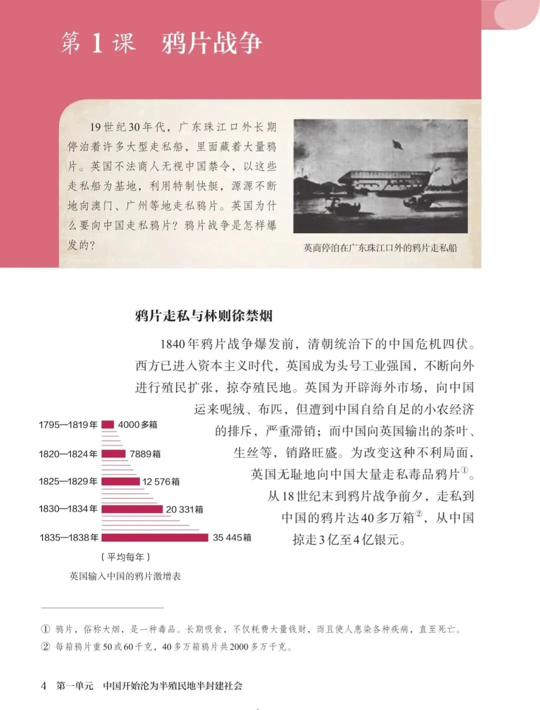 课本上的注释告诉我们:鸦片,俗称大烟,是一种毒品。长期吸食,不仅耗费大量钱财,而且使人患染各种疾病,直至死亡。每箱鸦片重50或60千克,40多万箱鸦片共2000多万千克。