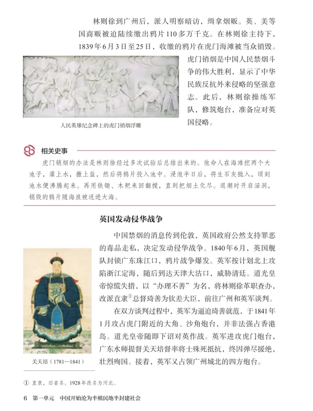 课本上的"相关史事"详细描述了虎门销烟的方法:命人在海滩挖两个大池子,灌上水,撒上盐,然后将鸦片投入池中。浸泡半日后,将生石灰抛入,顷刻池水便沸腾起来。再用铁锄、木耙来回翻搅,直到把烟土化尽。退潮时开启涵洞,销毁的鸦片随海浪被送进大海。