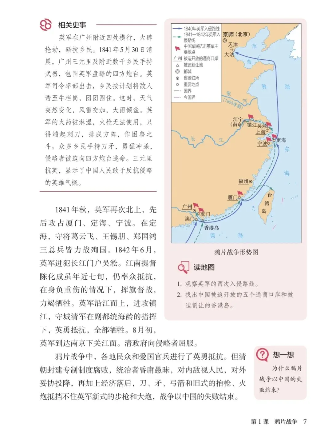 课本上的"相关史事"记载了三元里抗英的故事:1841年5月30日清晨,广州三元里及附近数千乡民手持武器,包围英军盘踞的四方炮台。英军司令率部出击,乡民按计划将敌人诱至牛栏岗,团团围住。这时,天气突然变化,风雷交加,大雨倾盆。英军的火药被淋湿,火枪无法使用,只得端起刺刀,排成方阵,作困兽之斗。众多乡民手持刀矛,勇猛冲杀,侵略者被迫向四方炮台逃命。