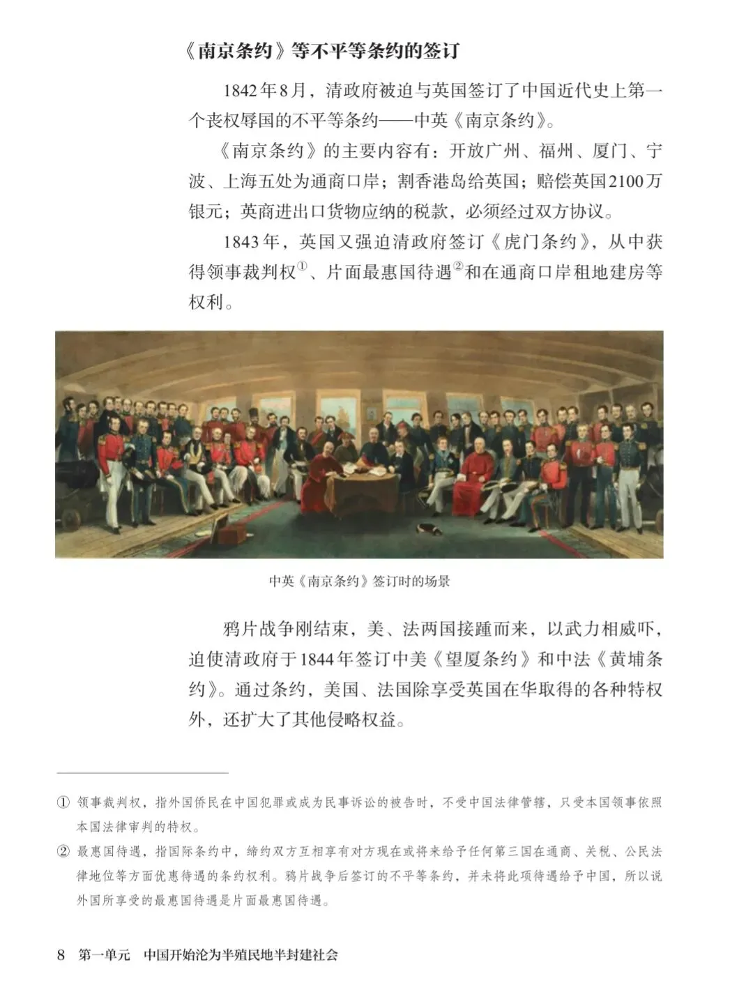 鸦片战争刚结束,美、法两国接踵而来,以武力相威吓,迫使清政府于1844年签订中美《望厦条约》和中法《黄埔条约》。通过条约,美国、法国除享受英国在华取得的各种特权外,还扩大了其他侵略权益。