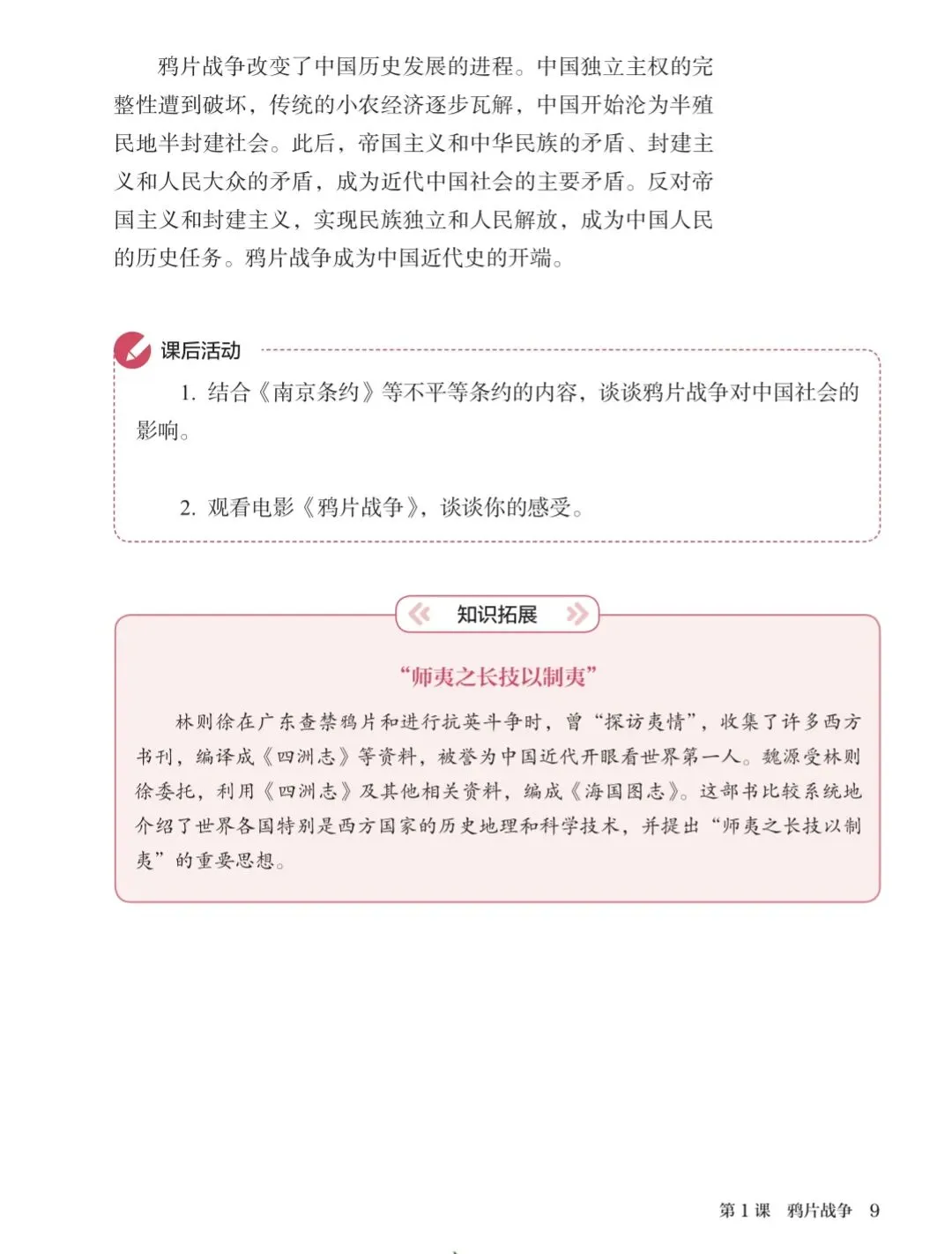 课本上的"知识拓展"说,林则徐在广东查禁鸦片和进行抗英斗争时,曾"探访夷情",收集了许多西方书刊,编译成《四洲志》等资料,被誉为中国近代开眼看世界第一人。