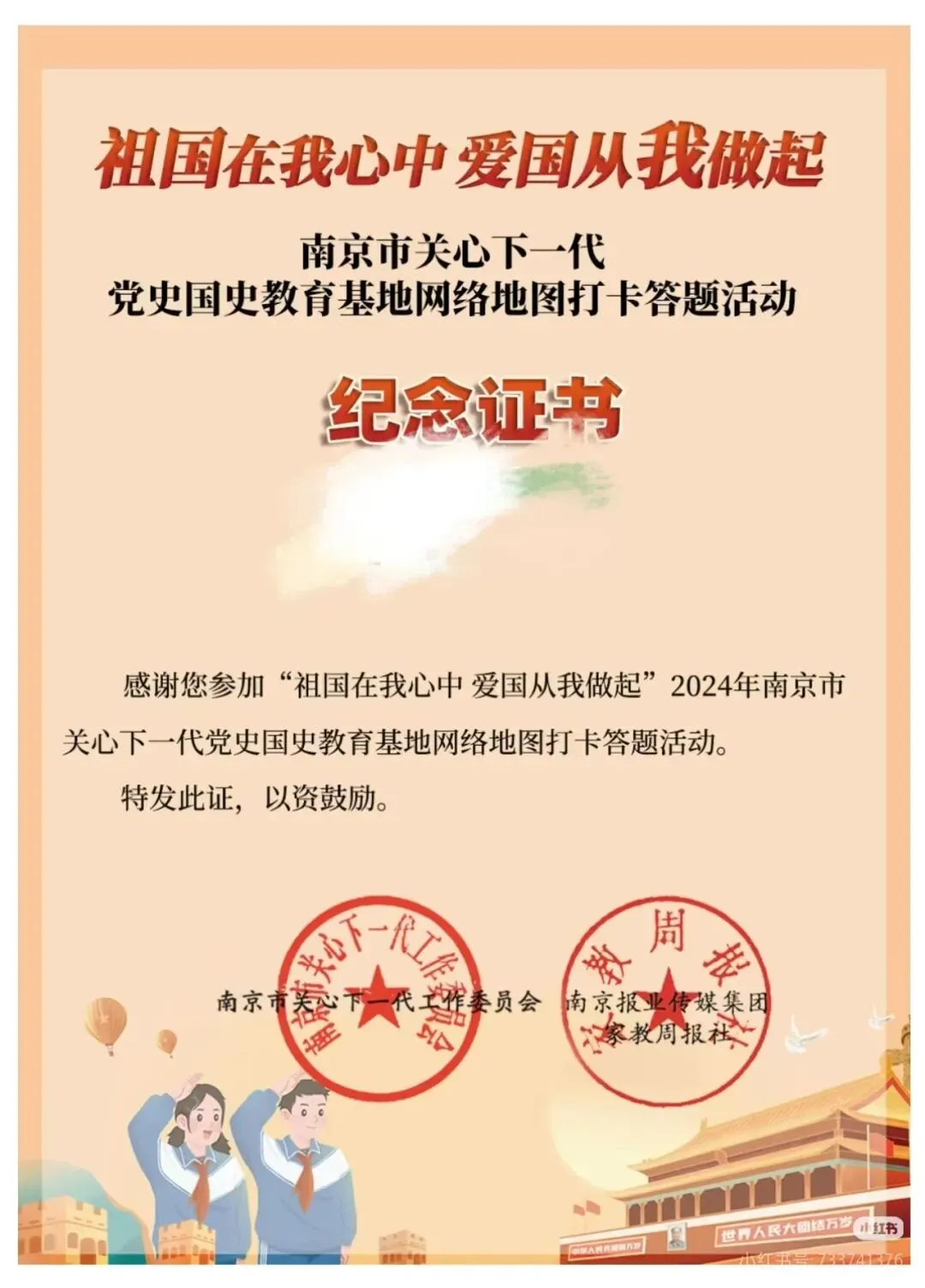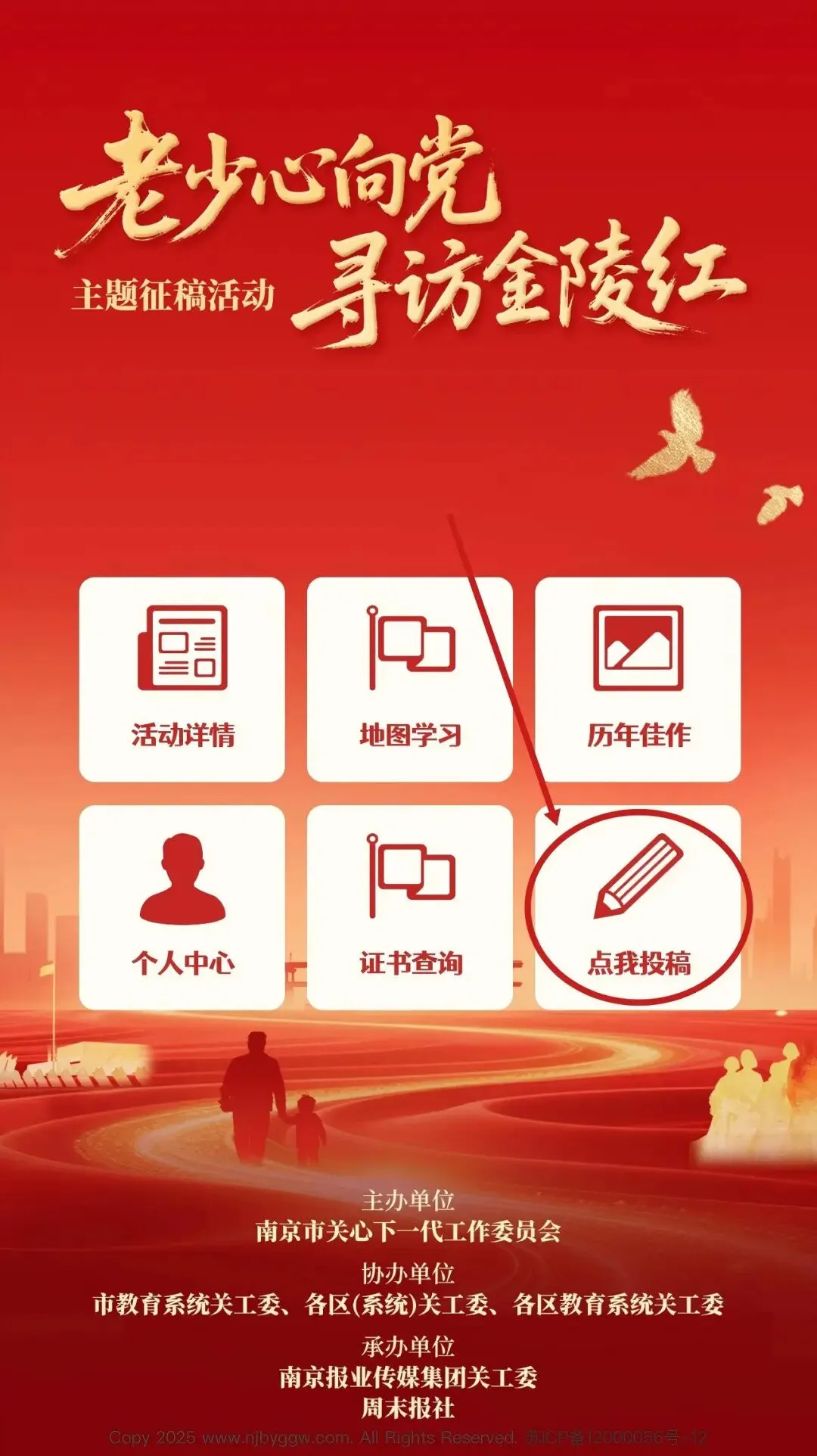 1. 要求围绕“老少心向党 寻访金陵红”主题,紧扣庆祝中国共产党成立105周年、红军长征胜利90周年节点,结合线上浏览网络地图、线下走访党史国史教育基地的亲历见闻与真切感悟,以及在校或线上聆听“大思政”宣讲课的所思所感,读懂南京红色底蕴,感悟南京党史故事,筑牢听党话、跟党走的理想信念根基。内容需导向正确、健康向上、原创性强,杜绝抄袭。