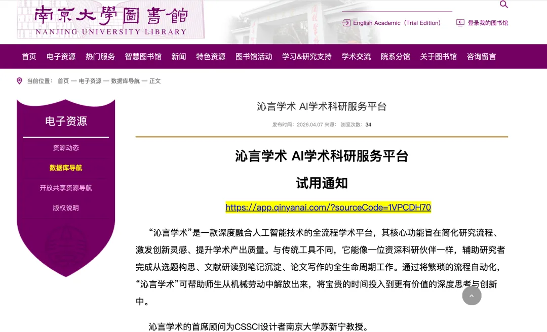 南京大学作为国家 “双一流” 建设高校,始终以高标准构建学术资源与知识服务体系。图书馆经过严格遴选,将沁言学术纳入官方服务矩阵,依托 AI 技术为师生提供全流程科研支撑,助力提升文献研读、学术写作与创新研究效率,进一步完善校园数字学术生态。