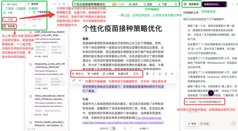 学术写作下笔难?工具区、写作区与写作助手对话区三区一屏完成,边写边问边引用,彻底解决结构不会搭建,写作没思路,语言不学术、格式调整繁琐等问题,让你从提纲到成稿一站式完成,写得更快更稳更学术。