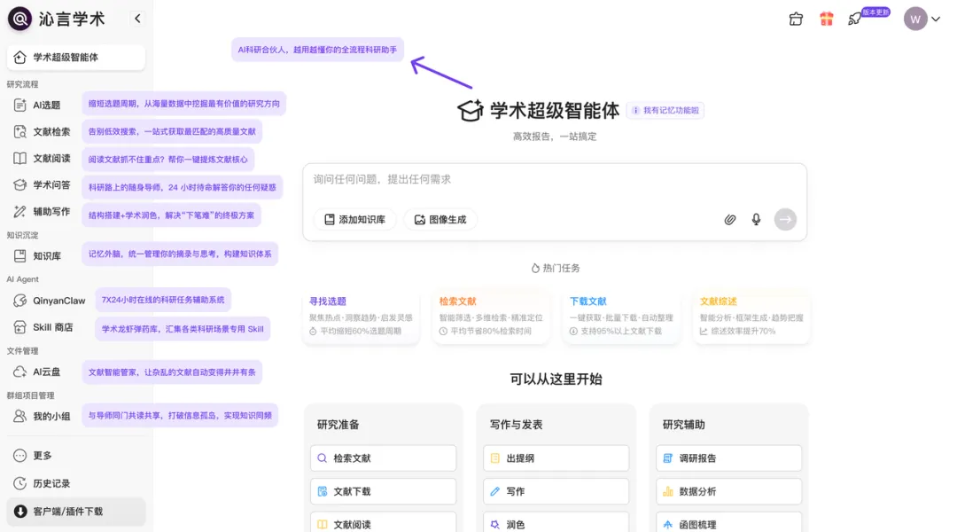 学术超级智能体将文献检索、深度阅读、知识管理、学术写作等全流程串联起来,形成一个真实文献支撑的自动化科研闭环,拥有持续记忆能力,是越用越懂你的全流程学术助手。