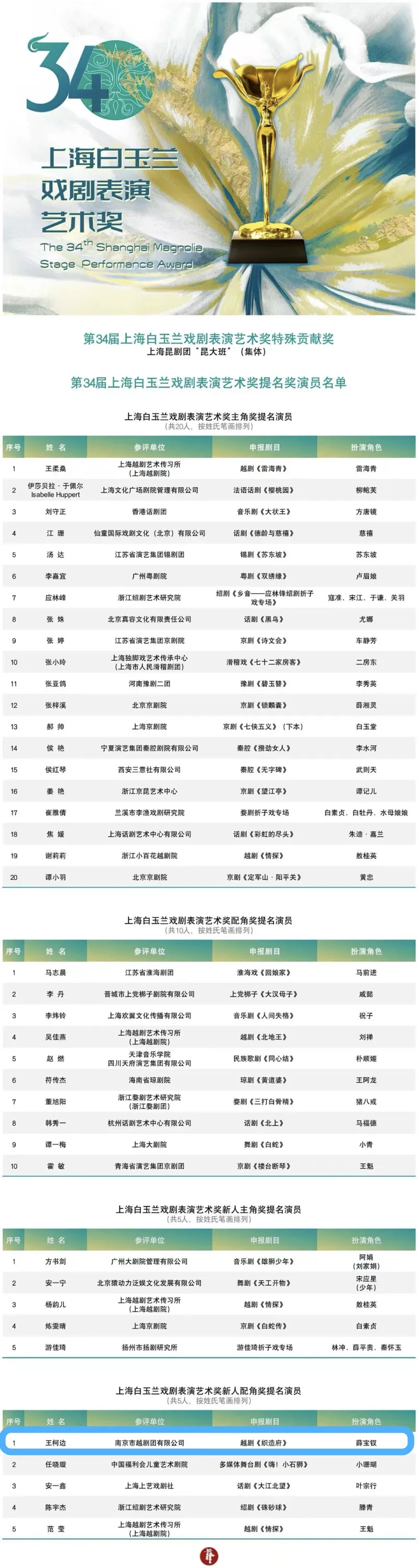 第34届上海白玉兰戏剧表演艺术奖提名奖名单公布,南京市越剧团优秀青年演员王柯边凭借在诗韵越剧《织造府》中对“薛宝钗”一角的出色演绎,成功入围新人配角奖提名。申报时年仅19岁的她,也是本届提名演员中最年轻的一位。