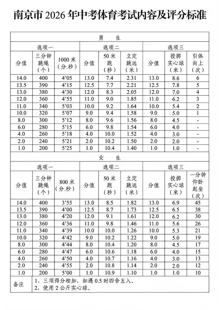 南京市中考体育考试采取选项办法,考生在三类选项中各选择一个项目测试,三项满分为40分,计入升学总分。