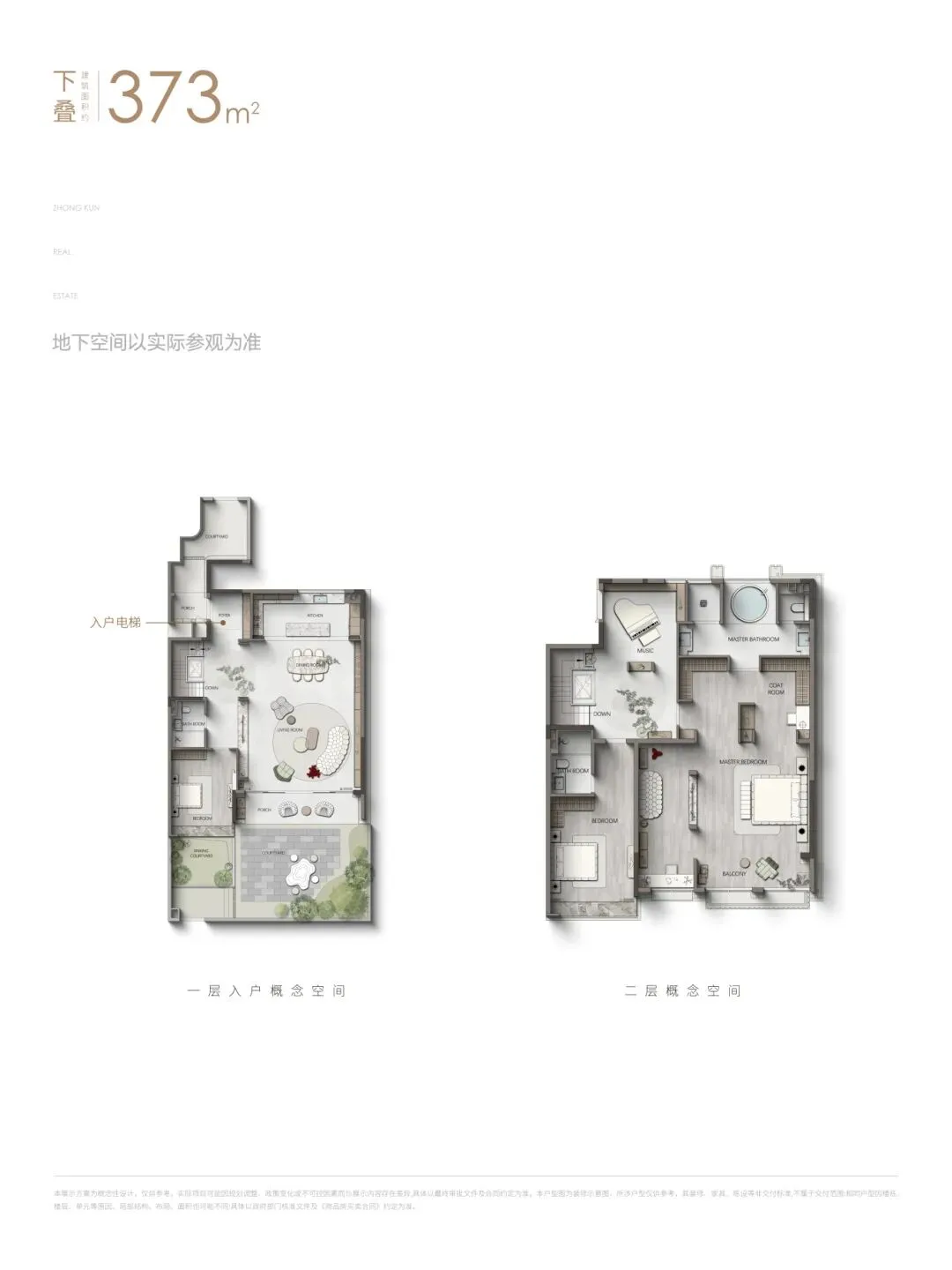 下叠373㎡,户型整体分为地下一层+地上一二层,拥有南边入户+庭院,每一户都有负二层2个私家车位,因为超级使用率,所以也拥有超绝空间感