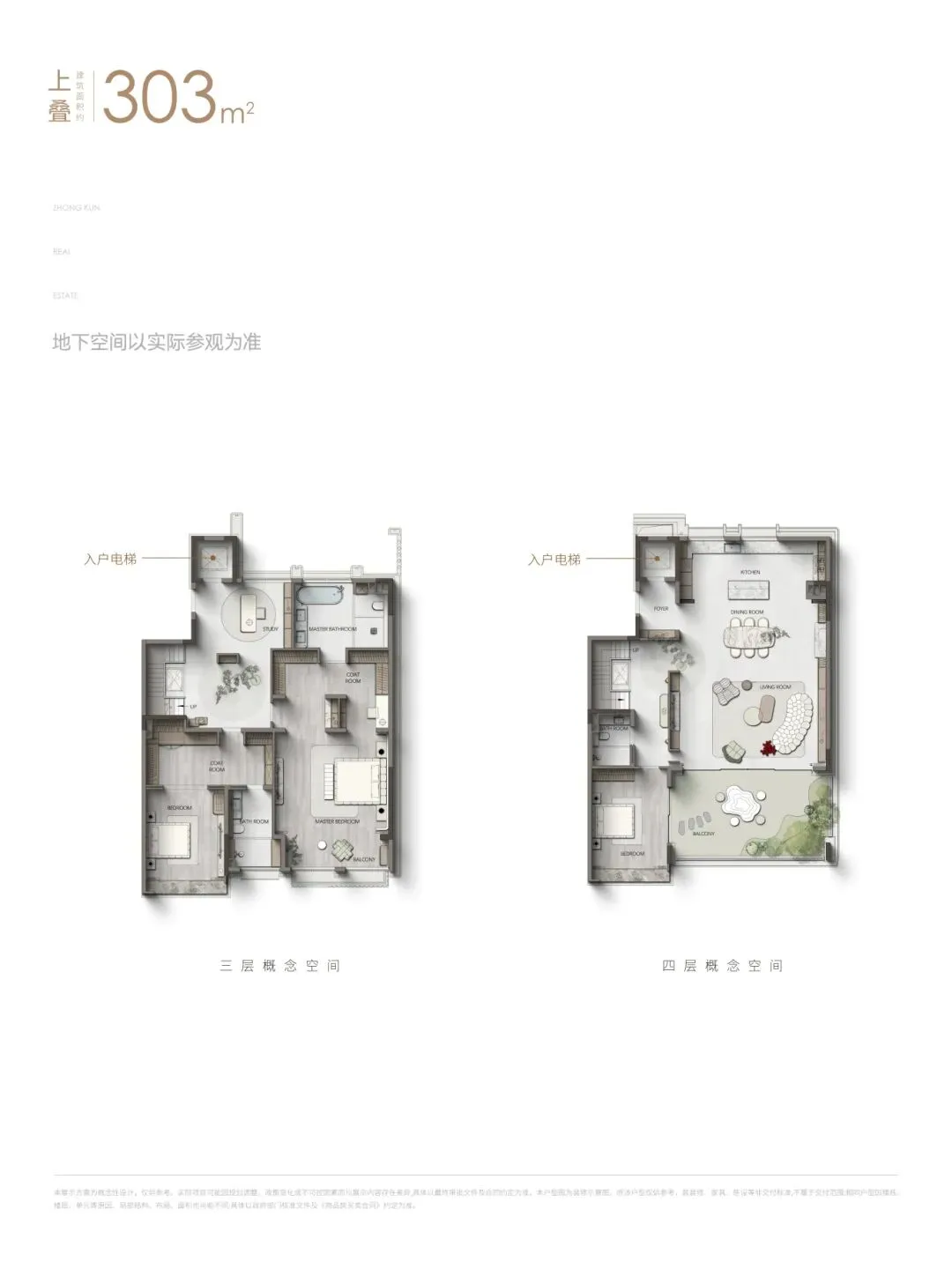 303㎡的上叠,分为三、四层及负一层,同样负二层拥有两个私家车位,超大的露台